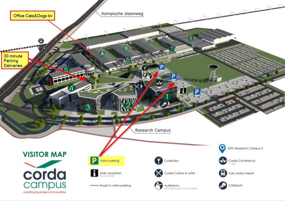 Corda Campus beschikt over verschillende parkings met in totaal 3300 parkeerplaatsen. Bezoekers kunnen zich parkeren op de bezoekersparking vlak voor het algemeen onthaal. Wandel via de bezoekersparking naar de ronde hoek van gebouw 5 en volg het pad tussen gebouw 5 en Hal A. Wandel tot je achteraan uitkomt aan de grote glazen inkomhal. Je kan je hier aanmelden via het scherm, of ons even bellen eens aangekomen.